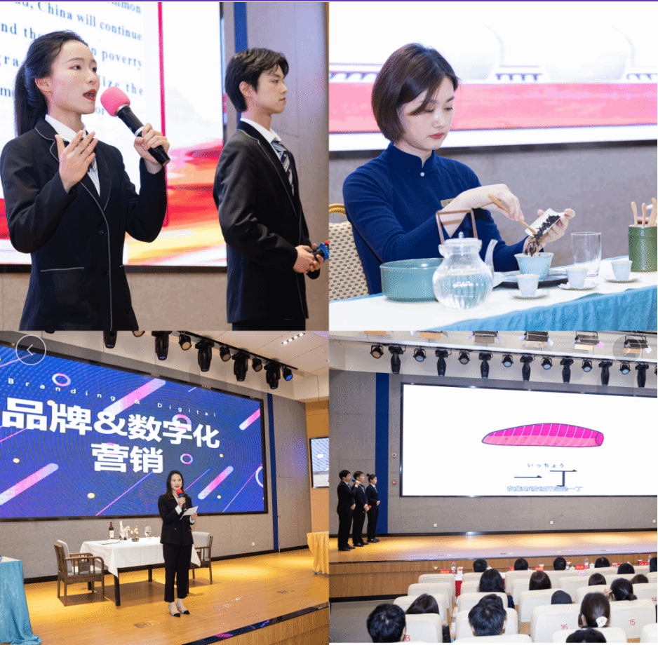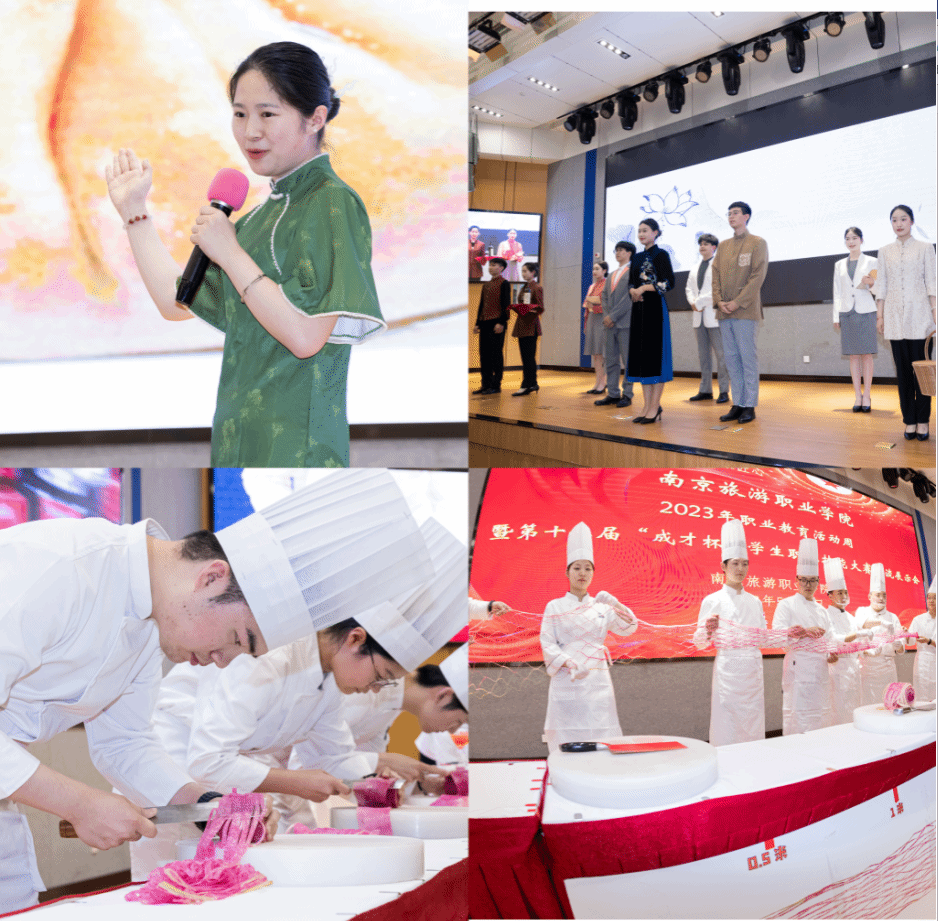 之后,参会人员现场观看了各二级学院学生代表的参赛成果分享展示。酒店管理学院带来了“职教新时代 筑梦新征程”工装风采秀和“心栖梦归处不负韶华年”酒店职业经理人成长之路情景剧;旅游管理学院刘星月同学以“学思践悟二十大 奋斗有为正当时”为主题,声情并茂地对河下古镇进行了导游词讲解;烹饪与营养学院带来了主题为“传承技艺铸匠魂,开拓奋进建新功”技能展示,通过对片渔网、豆腐雕花、分子烹饪项目的展示,致敬传统,创新理念;旅游外语学院生动地开展了“理解当代中国 践行时代使命”英语演讲展示以及“不忘初心教师梦,砥砺前行得始终”日语配音秀;人文艺术学院充满创意地表现了以“舞动运河 情系中华”为主题的现代舞蹈秀和工艺美术现场彩绘。各二级学院的成果展示密切结合2023年职业教育活动周“青春践行二十大 厚植实干聚匠心”和“技能成才 强国有我”主题,充分体现了劳模精神、劳动精神、工匠精神,精彩纷呈,令人印象深刻。