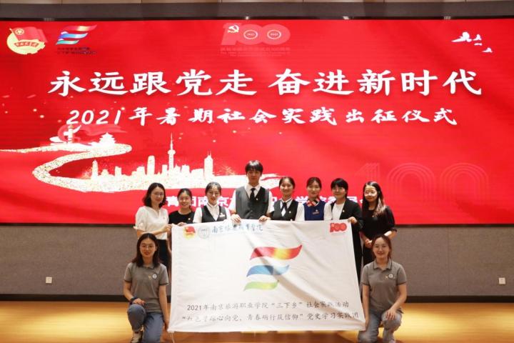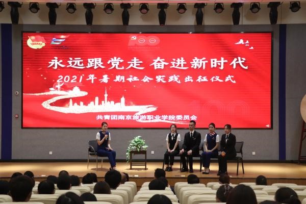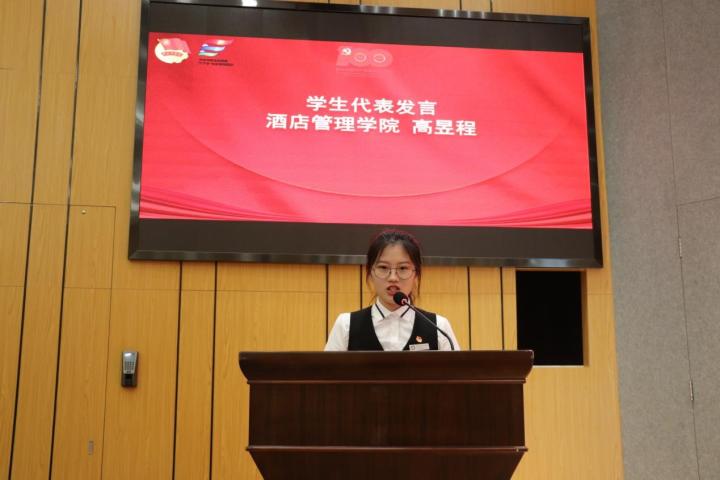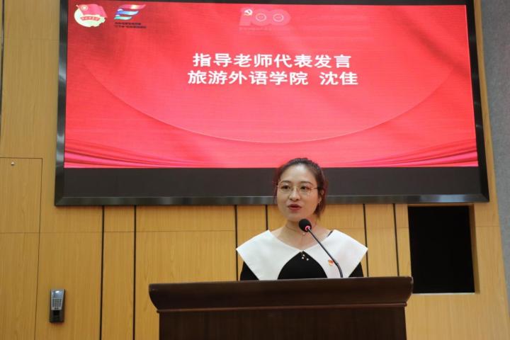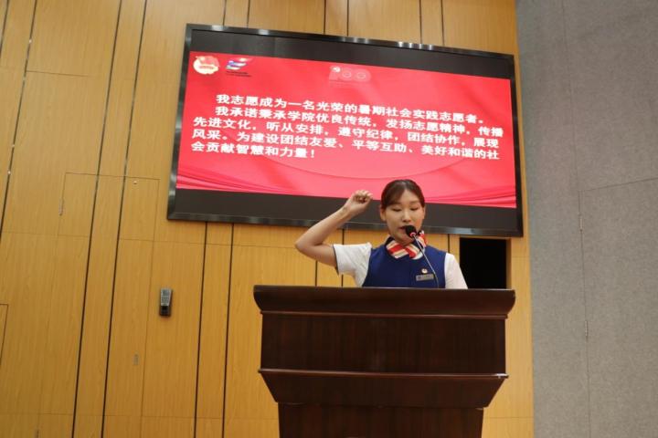 随后,暑期社会实践指导教师代表沈佳、学生代表高昱程分别进行发言。她们表示暑期社会实践要与党史学习教育相结合,要把所学知识与社会实践相结合,在实践中探索真知。最后,学生代表吴文珊带领全体教师和学生代表作出征仪式宣誓。