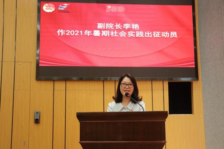 接着,李艳作出征动员。她强调,暑期社会实践是学生实践和思政教育的大课堂。第一,要坚定理想信念,珍惜实践机会;第二,要践行三牛精神,将专业特长与服务社会相结合;同时要求相关部门要做好安全教育,守好安全防线,以优异的成绩献礼建党百年。
