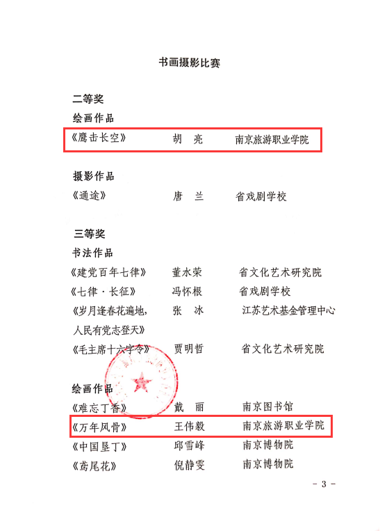 经学院工会广泛动员,教职工积极参与,我们选拔推荐了多幅围绕比赛主题创作的书画、摄影及书法作品参加比赛。近日,省级机关干部职工庆祝中国共产党成立100周年歌唱比赛和书画摄影比赛活动评选结果出炉,我们胡亮老师创作的绘画作品《鹰击长空》获书画摄影比赛二等奖,王伟毅老师创作的绘画作品《万年风骨》获书画摄影比赛三等奖,郑秋老师创作的书法作品《毛主席诗词》获书画摄影比赛佳作奖。