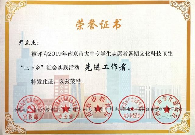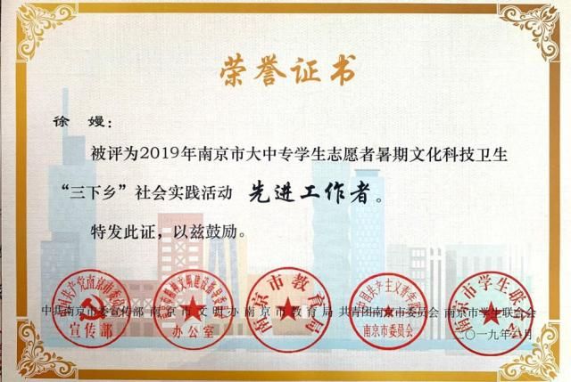 近日,在江苏省省委宣传部、省文明办、省教育厅、团省委、省学联联合组织开展的2019年江苏省大中专学生志愿者暑期文化科技卫生“三下乡”社会实践活动评选中,我们团队和个人荣获省级奖项3项和市级奖项9项,其中“印象南旅·走进空港观察团”荣获省级“优秀团队”、刘文清同学荣获省级“先进个人”、“石塘人家乡村旅游区旅游服务质量评价及其对游客满意度的影响”荣获省级“优秀调研报告”,我们团委荣获市级暑期社会实践活动“先进单位”,“美丽乡村护卫队”等3个团队荣获市级“优秀团队”,“旅游中游客对餐饮需求的社会调研实践团队”荣获市级“优秀调研报告”,徐嫚和龙宇等4人分别获得市级“先进工作者”和“先进个人”。