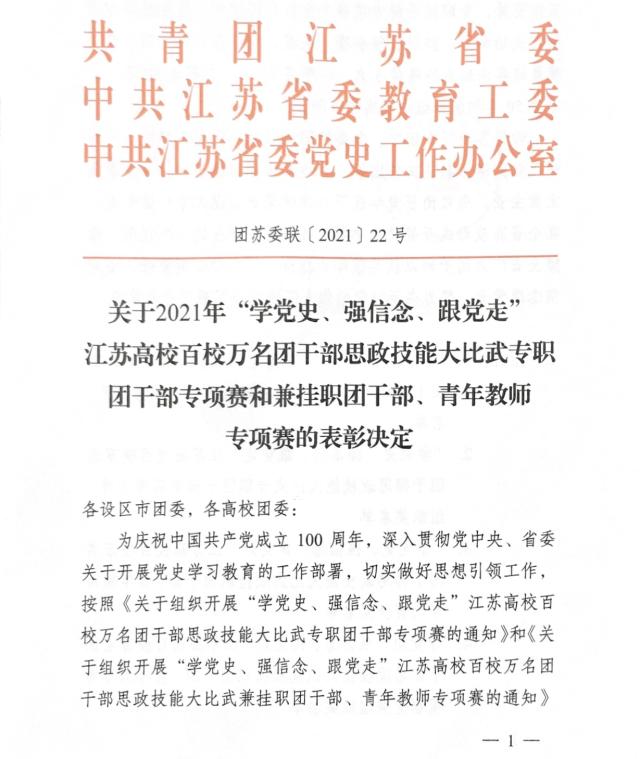 近日,共青团江苏省委、中共江苏省委教育工委、中共江苏省委党史工作办公室联合下发《关于2021年“学党史、强信念、跟党走”江苏高校百校万名团干部思政技能大比武专职团干部专项赛和兼挂职团干部、青年教师专项赛的表彰决定》...
