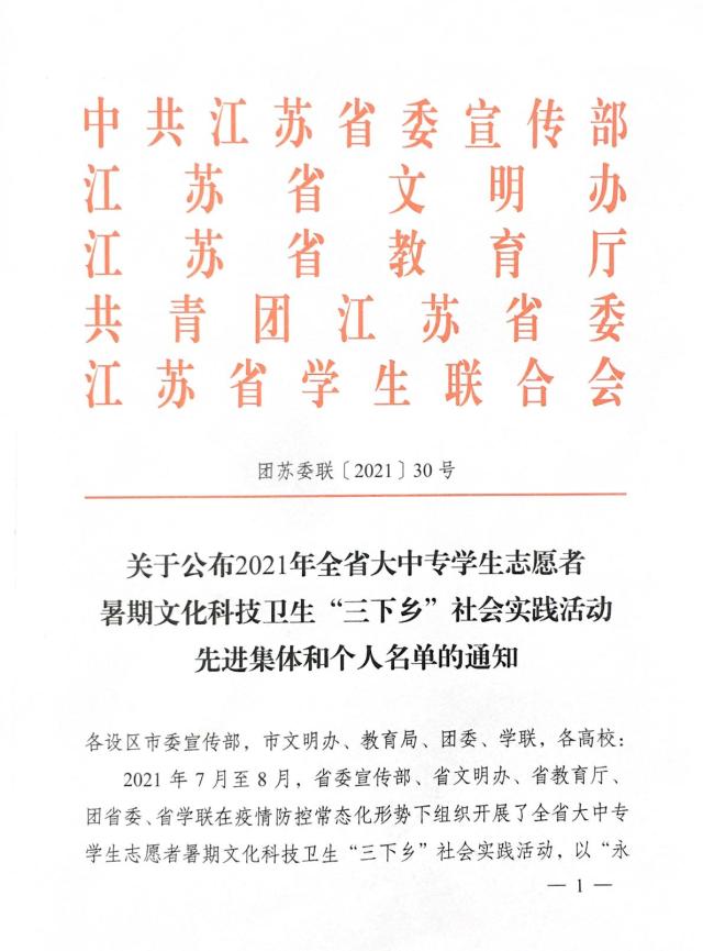 近日,中共江苏省委宣传部、江苏省文明办、江苏省教育厅、共青团江苏省委和江苏省学生联合会联合下发《关于公布2021年全省大中专学生志愿者暑期文化科技卫生“三下乡”社会实践活动先进集体和个人名单的通知》,对先进集体和个人进行了表彰,...