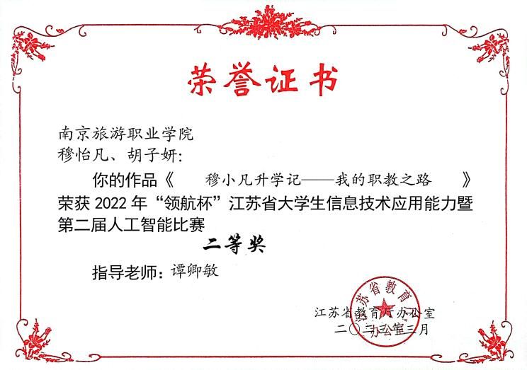 近日,江苏省高等学校教育信息化研究会公布了2022年“领航杯”江苏省大学生信息技术应用能力比赛暨第二届人工智能比赛获奖名单,我们喜获二等奖1项,三等奖4项,获奖总数再创新高。由我们谭卿敏老师指导的《穆小凡升学记—...