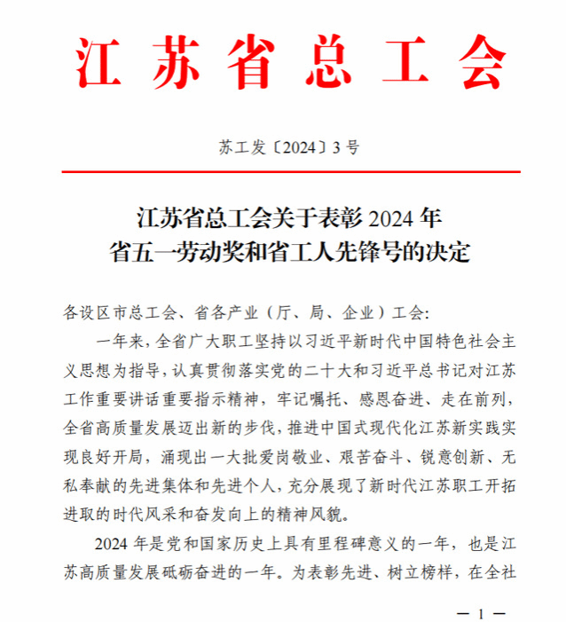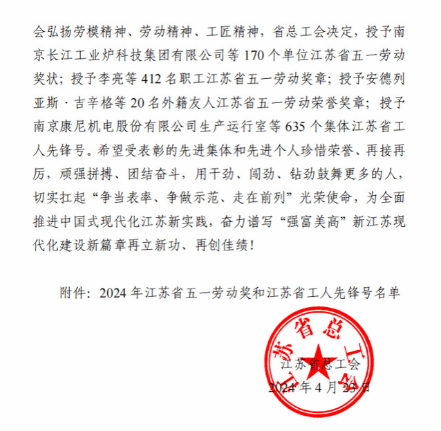 4月23日,江苏省总工会印发《江苏省总工会关于表彰2024年省五一劳动奖和省工人先锋号的决定》,伟德国际victor1946烹饪与营养学院荣获“2024 年江苏省工人先锋号”荣誉称号。