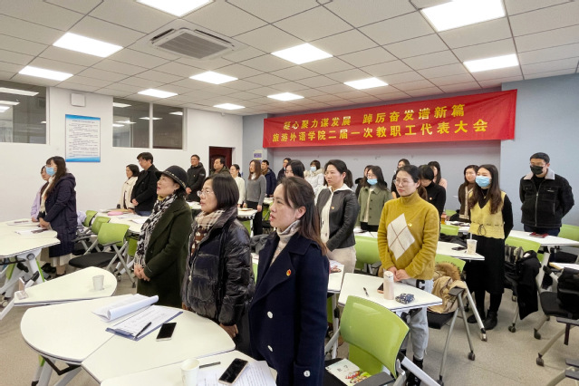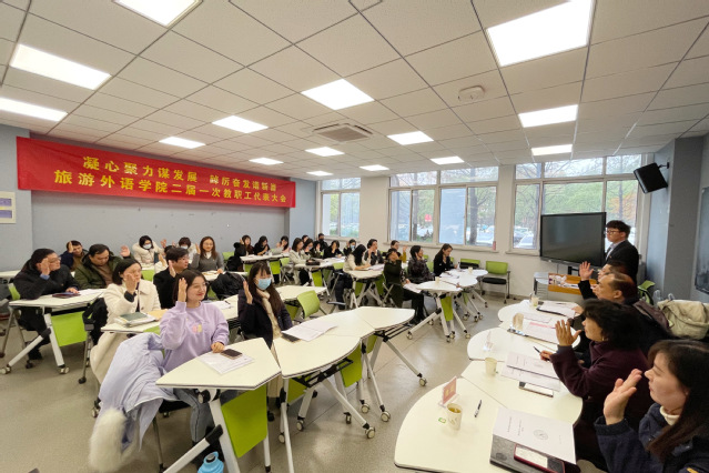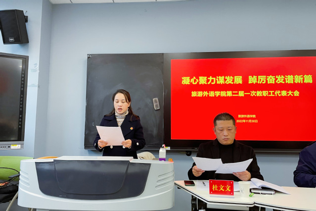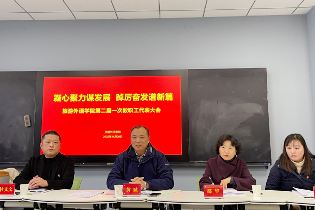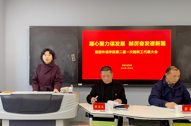 为了更好地发挥二级教代会的民主管理和民主监督作用,推进基层民主建设,保证教职工民主参与、民主管理和民主监督的权力,发挥教职工在学院各项工作稳步发展过程中的重要作用。11月30日下午,旅游外语学院第二届教职工代表大会第一次会议在教学楼3106智慧教室召开。学院党委副书记、副院长黄斌,旅游外语学院党政班子及全体教代会代表参加会议, 旅游外语学院分工会委员邢盖主持会议。