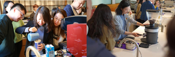 在制作环节,袁欢老师讲解了咖啡机的使用、安全注意事项,演示了咖啡液的萃取、奶泡打发、拉花等制作过程,曾祺尧老师与两位老师一起将“学员”分组,开展“实践教学”,每一位参加的老师都亲手制作了一杯属于自己的风味咖啡,有些自己品鉴,有些则送给同事或学生,成为了秋日南旅校园中的一抹暖意。活动在咖啡香、奶香和各种风味的香气中结束,缓解了老师们在工作生活中的紧张情绪,增进了同事之间的感情。