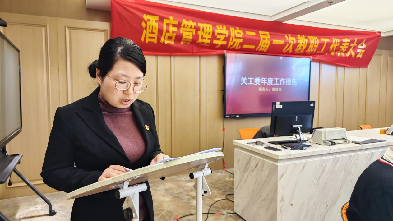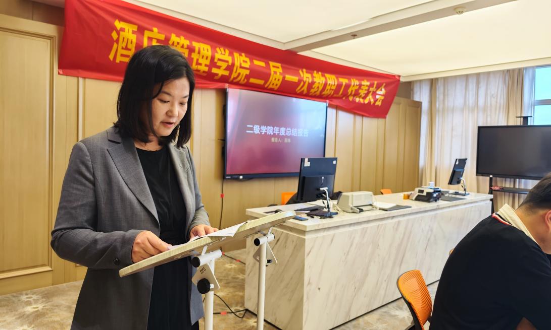 大会在庄严的国歌声中拉开帷幕。酒店管理学院院长苏炜从“信念启航,发挥总支政治核心作用”、“产教融合,提升专业发展影响力”、“强化教学团队建设,全面提升教科研综合实力”和“坚持立德树人,努力提高学生工作成效”四个方面作学院年度工作报告。报告展现了在学院党委的正确领导下,酒店管理学院全体教职工凝心聚力、 踔厉奋发,全面贯彻党的教育方针,落实立德树人根本任务,在专业建设、人才培养、师资团队建设等各方面取得了突出成绩。