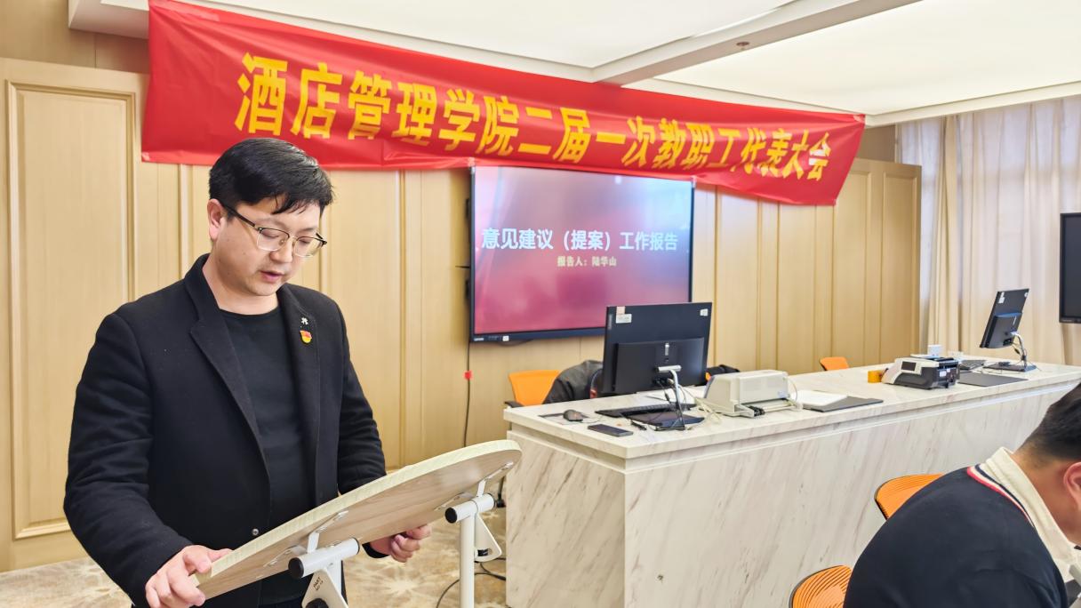 酒店管理学院党总支副书记陆华山作教代会意见建议(提案)工作报告。意见建议(提案)工作是二级教代会工作的重要内容,是教职工行使民主权利,实行民主管理和民主监督的重要一环,本次教代会共征集到酒店管理与数字化运营、大数据与财务管理、大数据技术三个教研室共6条意见建议(提案),内容包括管理体制完善、教学与人才培养、师资队伍建设培训等方面,会议审议并通过了上述各项工作报告和意见建议(提案)。
