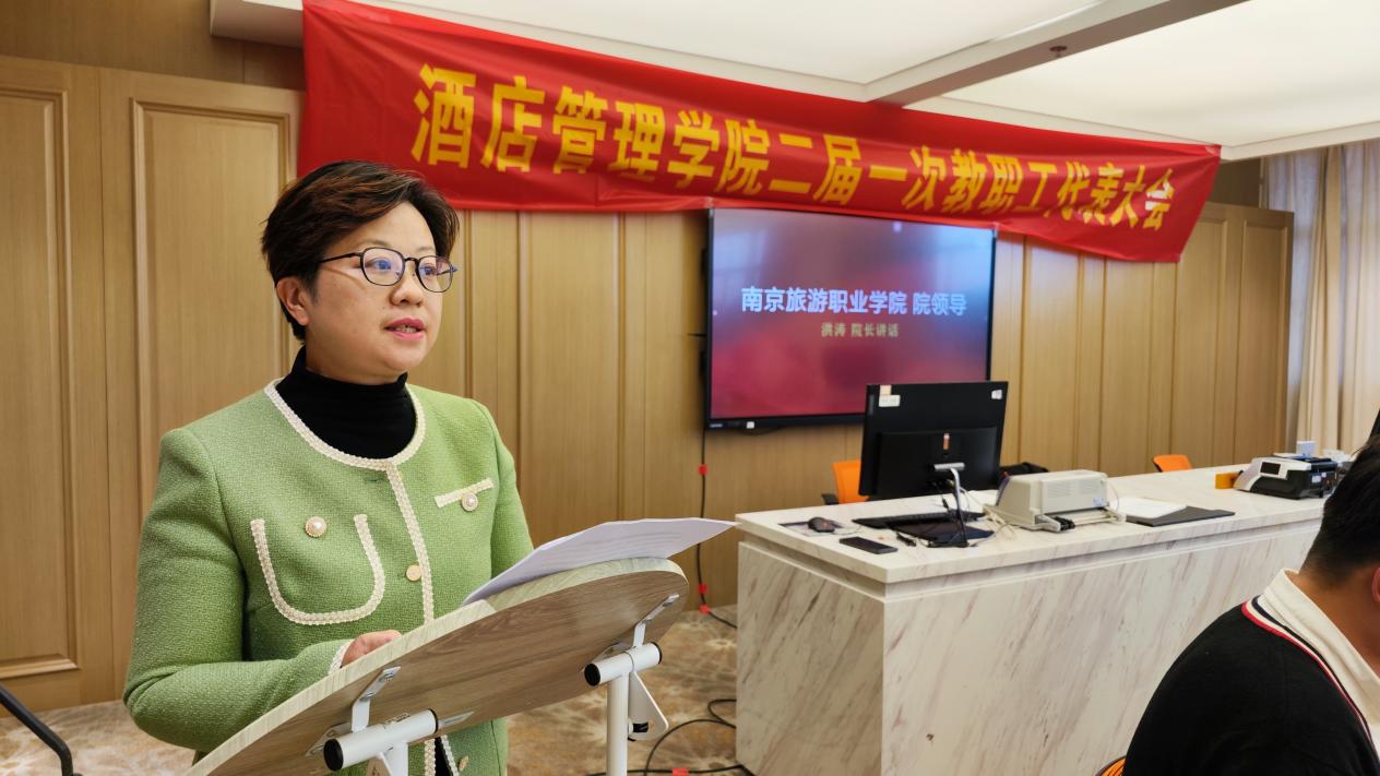 洪涛作总结讲话,她高度评价了本次教代会筹备工作,对酒店管理学院一年来取得的成绩给予肯定。希望学院不断探索和完善二级教代会制度,团结和动员广大教职工发扬主人翁精神;希望学院全体教职工要以本次教代会为契机,进一步落实立德树人根本任务,统一思想、凝心聚力、敢于担当、勇于进取,为学院高质量努力奋斗。