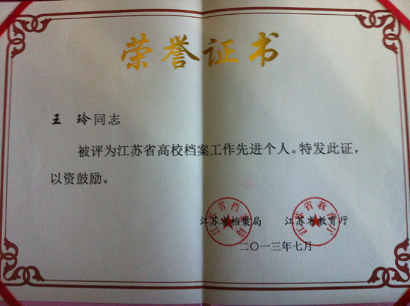 7月12日,江苏省高校档案工作会议在宁召开。会议对全省高校档案工作先进集体和先进个人进行了表彰。江苏省教育厅厅长沈健、省教育厅副巡视员马幸年、省档案局副局长项瑞荃、各高校分管档案工作校领导及档案部门负责人参加了此次会议。我们从事档案管理工作的王玲同志荣获“江苏省高校档案工作先进个人”称号。