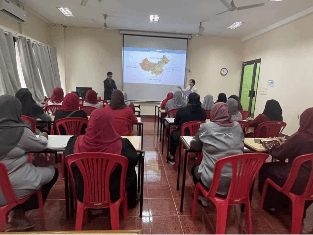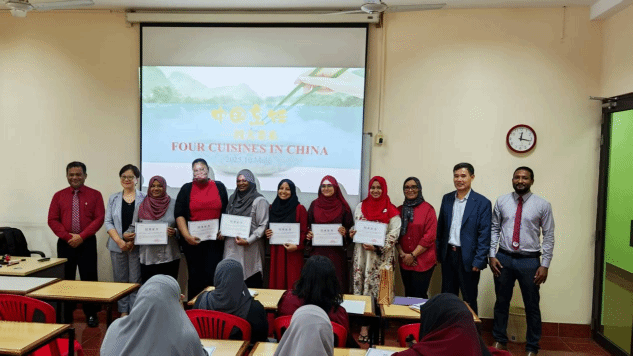 在参访活动中,出访团队陆理民、刘寒雨老师在马尔代夫理工学院开展了一场别开生面的“中文+中国饮食文化”授课交流活动。两位老师以生动有趣的方式向马方师生传递中国饮食文化的博大精深与中国职业教育理念,马方师生积极参与培训,对中国饮食文化表现出浓厚兴趣,交流现场互动积极,反响热烈。培训结束后,洪涛为参训学员颁发培训证书,并与马尔代夫理工学院校长合影留念,为本次文化交流活动画上圆满句号,也为中马文化交流搭建起一座坚实的桥梁。
