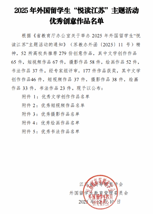 2025年12月10日,江苏省高等教育学会外国留学生教育管理委员会公布了江苏省2025年外国留学生“悦读江苏”主题活动优秀创意作品名单。在本次活动中,我们留学生表现优异,积极参与文学创作、绘画、短视频等多个赛道的作品评选,以独特的创新视角和出色的跨文化实践能力,展现出对江苏文化的深刻理解与感悟。