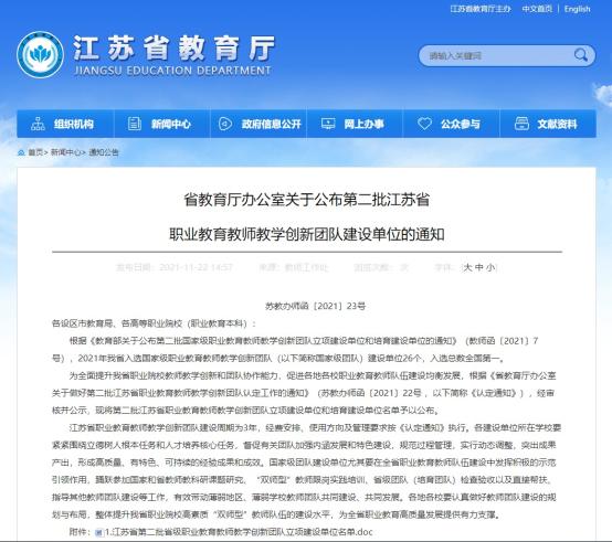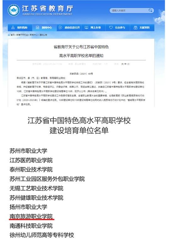 12月31日,江苏省教育厅发布《关于公布江苏省中国特色高水平高职学校名单的通知》,学院成功入选江苏省中国特色高水平高职学校建设培育单位,标志着学院在“十四五”期间迎来了新的发展机遇。