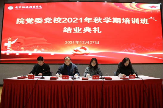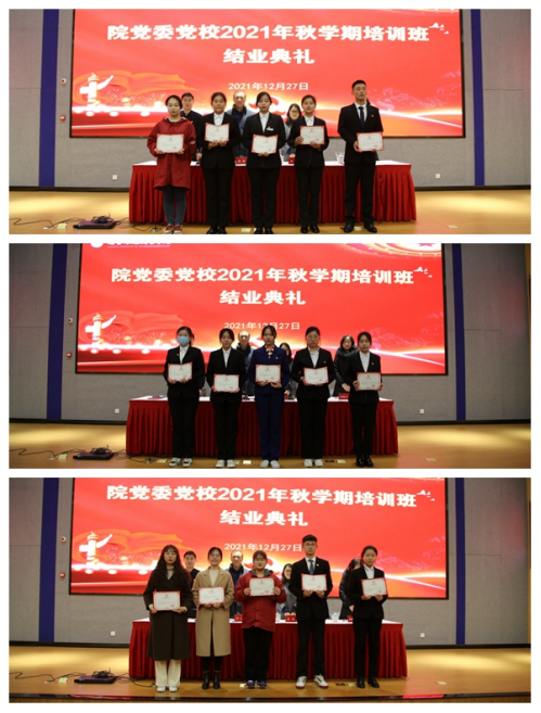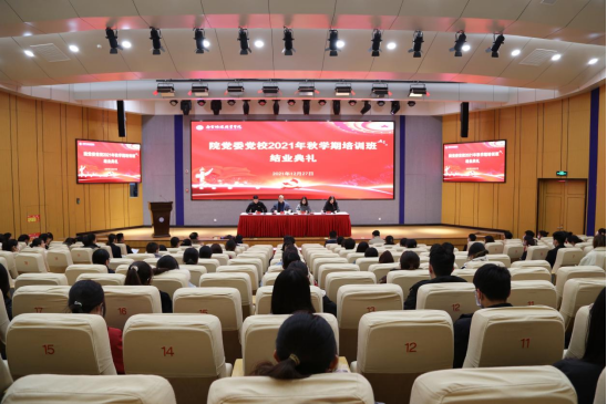 12月27日下午,院党委党校举行2021年秋学期培训班结业典礼,党委副书记、副院长、院党委党校校长黄斌,院党委委员、副院长、院党委党校副校长李艳,院党委委员、组织人事处处长、院党委党校副校长汪亮,党委宣传部部长、院党委党校副校长何晓岩,各二级学院(部)党总支(副)书记、学生党支部书记以及全体培训班学员参加典礼,结业典礼由何晓岩主持。