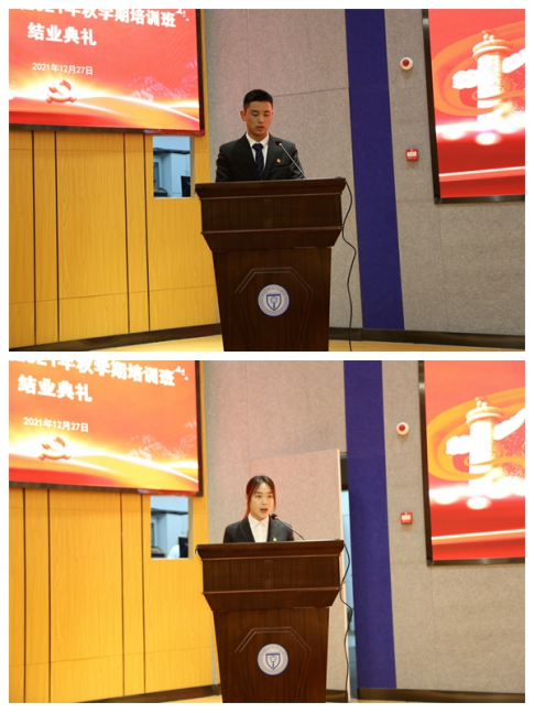 结业典礼上,酒店与管理学院20酒店管理4班的李超同学和旅游外语学院20旅游英语2班的刘晓宇同学作为优秀学员代表发言。他们首先代表全体参训学员,向全体授课老师的辛勤付出表示感谢,同时感谢学院党委提供的这次宝贵学习机会,让他们在为期一个月的时间里,对党组织有了更深的认识,明确了新时期大学生的历史使命,也更加坚定了加入中国共产党的决心。他们表示,将在今后的学习生活中,坚守理想信念,发挥模范作用,提升专业技能,用实际行动积极向党组织靠拢,争取早日加入中国共产党!