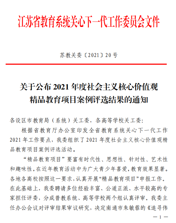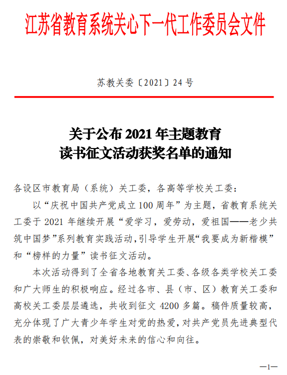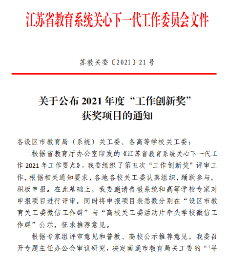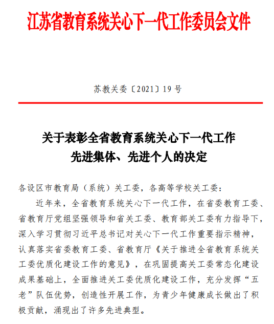 近日,江苏省教育系统关工委印发了《关于表彰全省教育系统关心下一代工作先进集体、先进个人的决定》《关于公布2021年度社会主义核心价值观精品教育项目案例评选结果的通知》《关于公布2021年度“工作创新奖”获奖项目的通知》《关于公布2021年主题教育读书征文活动获奖名单的通知》等系列文件,表彰一年来在关心下一代工作中表现突出的集体和个人。我们关心下一代工作荣获多项省级荣誉表彰。