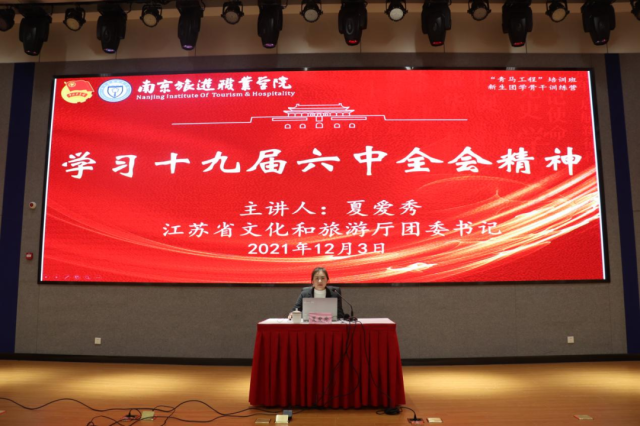 为深入学习贯彻党的十九届六中全会精神,更好的教育引导我们青年学生坚定不移听党话、矢志不渝跟党走,12月3日下午2:00,由团委举办的党的十九届六中全会精神专题学习讲座在图书馆报告厅举行。本次讲座由江苏省文化和旅游厅团委书记夏爱秀主讲,团委副书记沙成金,青马培训班以及新生骨干训练营共计99名学员参加了本次讲座,讲座由团委副书记沙成金主持。