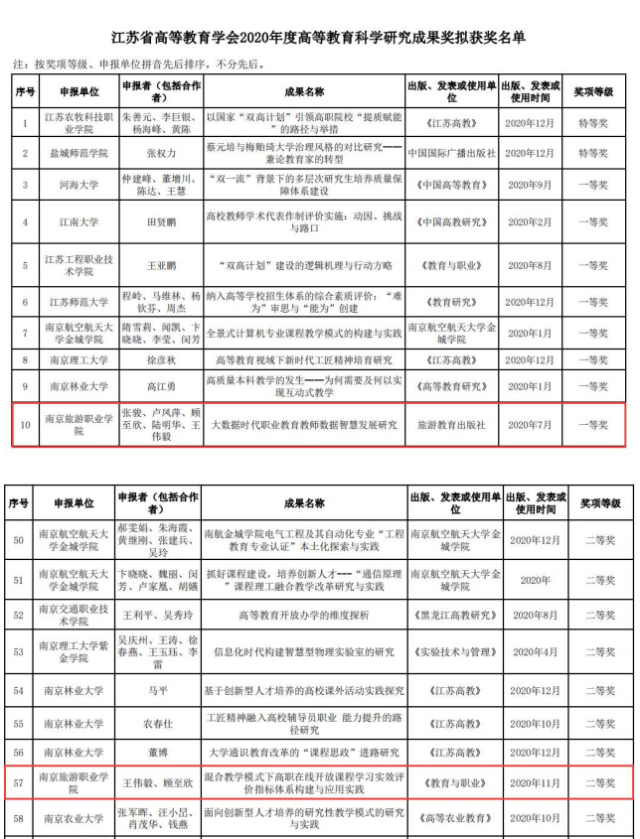近期,学院科研开发处陆续收到相关通知,由科研开发处组织申报,我们部分教师的科研成果获得不同部门的科研奖励,可喜可贺。具体有:在“江苏省高等教育学会2020年度高等教育科学研究成果奖”评比中,由张骏、卢凤萍、顾至欣等完成的著作《大数据时代职业教育教师数据智慧发展研究》荣获一等奖,王伟毅、顾至欣撰写的论文《混合教学模式下高职在线开放课程学习实效评价指标体系构建与应用实践》荣获二等奖。在“江宁区第十届学术年会优秀学术论文”评比中,我们共有五项成果获奖,其中张骏、谷静的论文分别荣获二等奖,陆志慧、陆明华、夏雯婷三人的论文分别荣获三等奖。