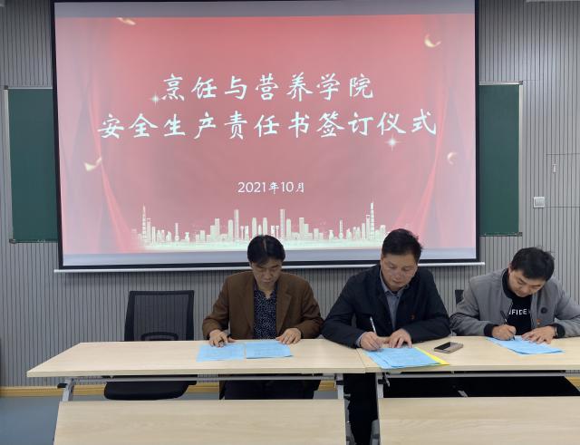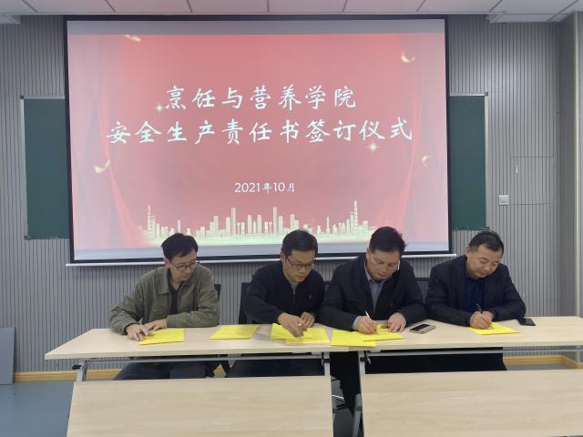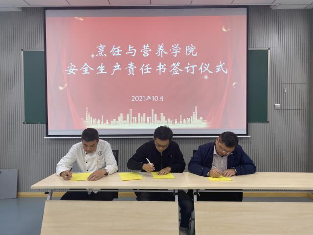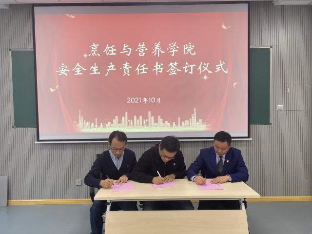 在专题学习的基础上,学院举行了烹饪与营养学院安全生产责任书签订仪式,实行分级责任制,要求每一级均需签订《安全生产责任书》,进一步压实全员安全生产责任制。