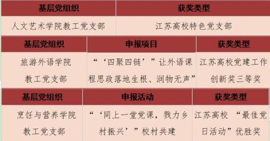 与此同时,省委教育工委公布了2019—2020年度党建工作创新奖、2020年度“最佳党日活动”优胜奖和高校特色党支部评选结果,我们旅游外语学院教工党支部的 “‘四聚四链’”让外语课程思政落地生根、润物无声”荣获江苏省高校2019-2020年度党建工作创新三等奖;烹饪与营养学院教工党支部开展的“‘同上一堂党课,戮力乡村振兴’”校村共建主题党日活动荣获2020年度高校“最佳党日活动”优胜奖;人文艺术学院教工党支部获评江苏高校特色党支部。我们党委报送的项目和活动全部获奖。