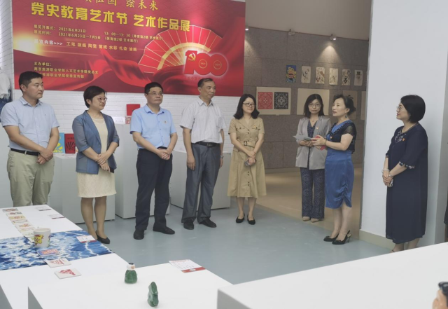 本次党史教育艺术节以“学党史、颂祖国、绘未来”为主题,集党史艺术作品展、廉政书画作品展、专题讲座、文艺汇演为一体。开幕式上,人文艺术学院院长曹娅丽介绍了本次作品展主要由工艺美术品设计、环境艺术设计和会展策划与管理三个专业共同完成,展览将艺术专业课程与党史学习、廉政教育相融合,人文艺术学院师生通过工笔画、版画、油画、陶瓷、剪纸、布艺等艺术形式创作了两百余件党史、廉政等主题文创作品,用形象化的艺术语言,充分展现了中国共产党的百年发展历程,具有良好的教育意义。