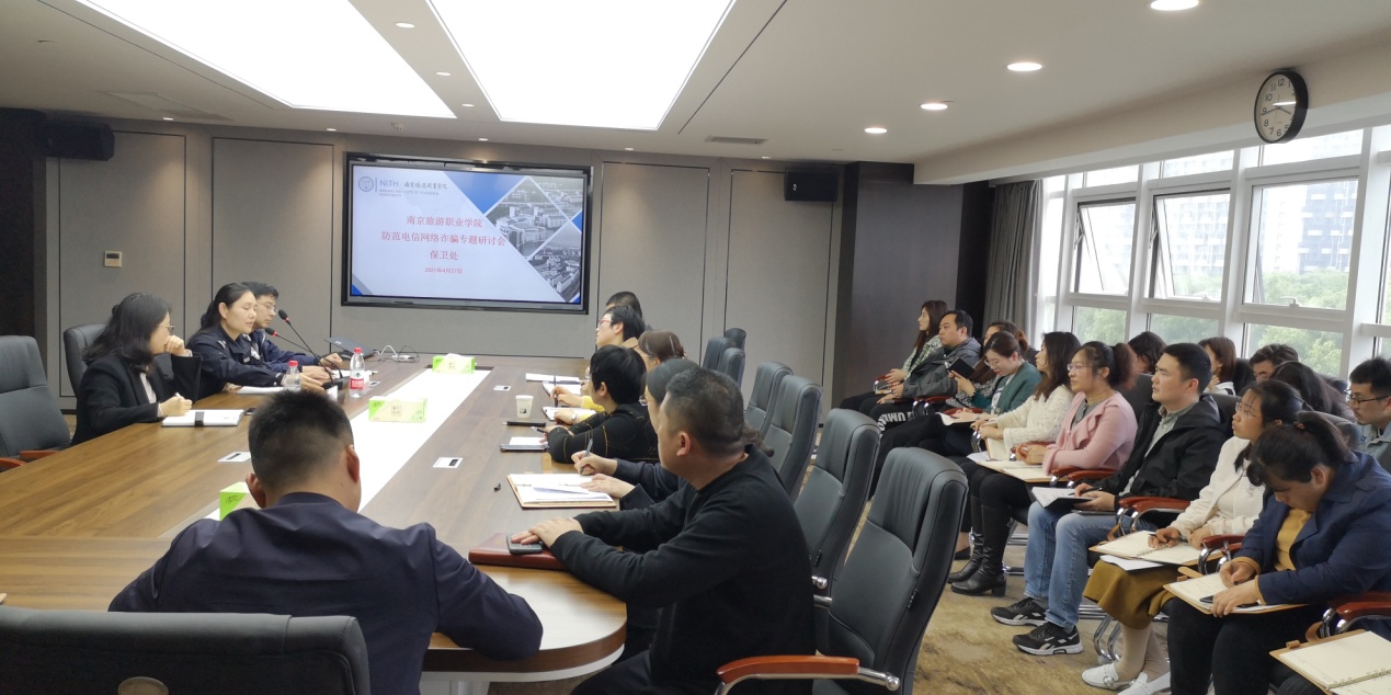 为切实做好我们防范电信网络诈骗宣传教育工作,提高师生的安全防范意识,增强师生防骗、识骗能力, 4月27日下午,保卫处邀请高新区派出所社区中队长李琳在行政楼411会议室召开防范电信网络诈骗专题研讨会,学院副院长李艳出席了会议。党委宣传部、学工处、后勤管理处、各二级学院党总支副书记、辅导员40余人参加了会议。会议由保卫处副处长徐华东主持。