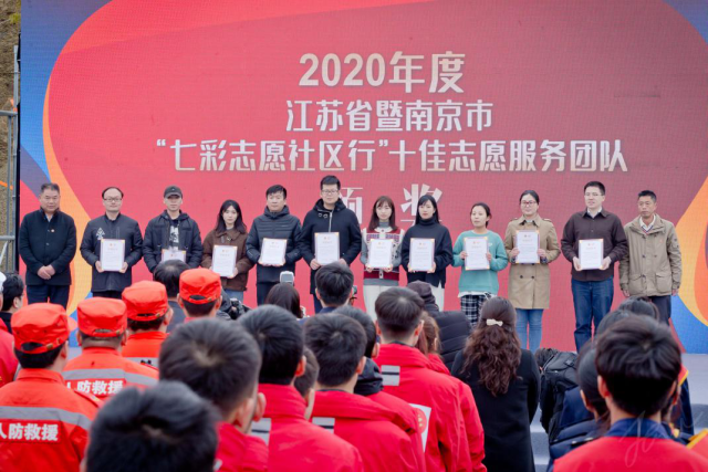 朱慧敏(左四)代表院我们领取江苏省暨南京市“七彩志愿社区行”十佳志愿服务团队奖项