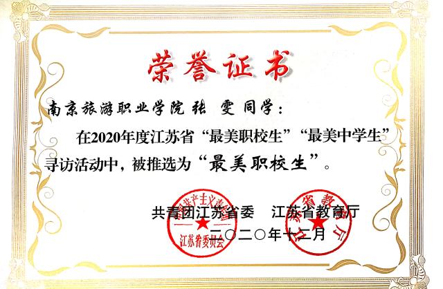 自2020年8月启动寻访活动以来,经二级学院申报、学院推荐、市级初评、省级评选,学院18级会展策划与管理专业龙宇、18级酒店管理专业张雯荣获江苏省“最美职校生”荣誉称号,成为“最美职校生”的先进典型。