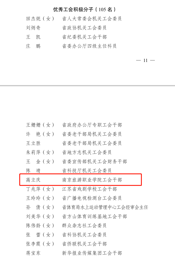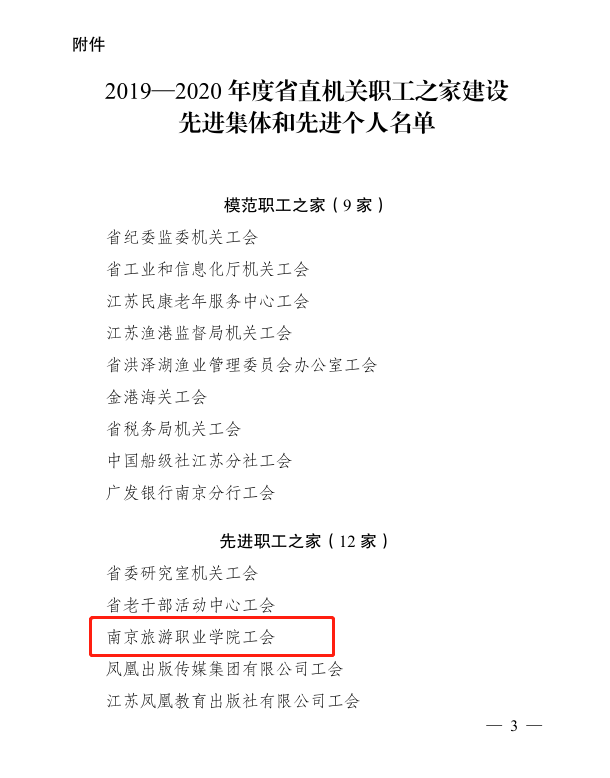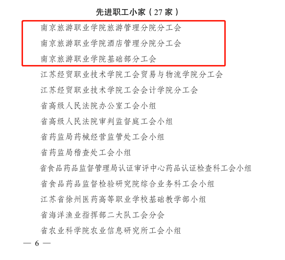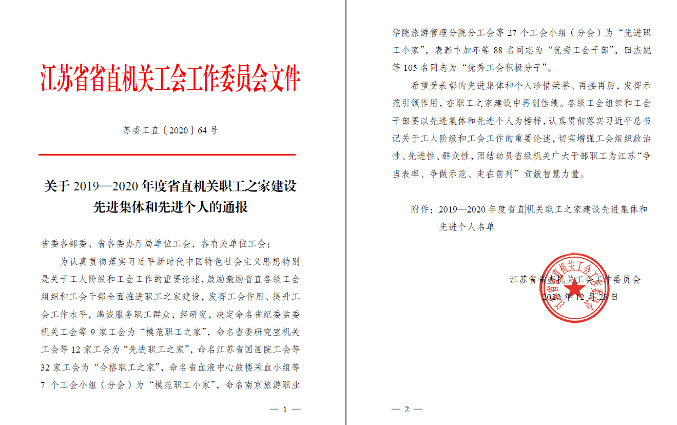 按照省直工会《关于开展2019—2020年度省直机关职工之家建设先进集体先进个人申报评选的通知》(苏委工直〔2020〕58号)要求,我们工会积极组织开展先进职工之家、先进职工小家和优秀工会积极分子的申报工作,经院党委同意、省文旅厅直属工会联合会推荐,受江苏省省直机关工会表彰,我们工会被评为“先进职工之家”;旅游管理学院分工会、酒店管理学院分工会、基础部分工会被评为“先进职工小家”;基础部分工会高立庆同志荣获“优秀工会积极分子”称号。旅游管理学院分工会陈菊霞同志受厅直属工会联合会表彰为“优秀工会积极分子”。