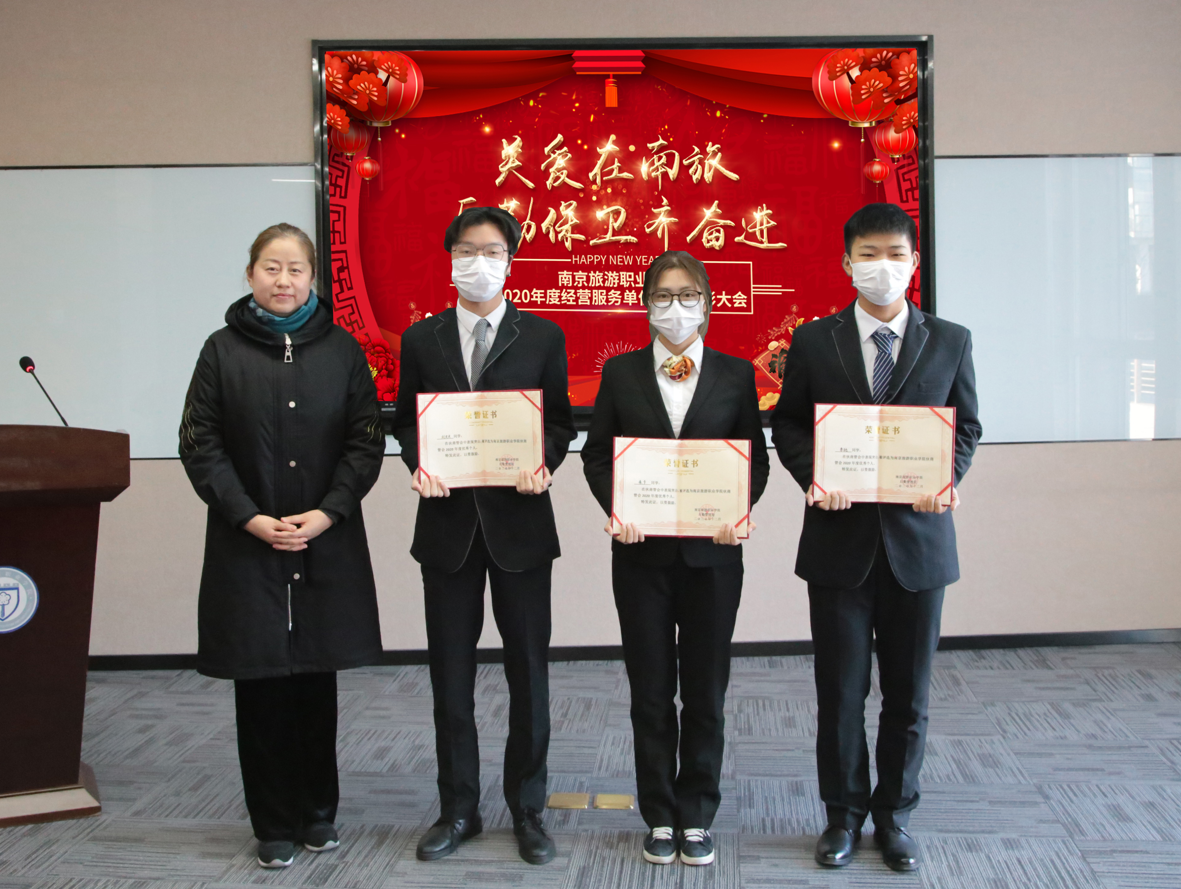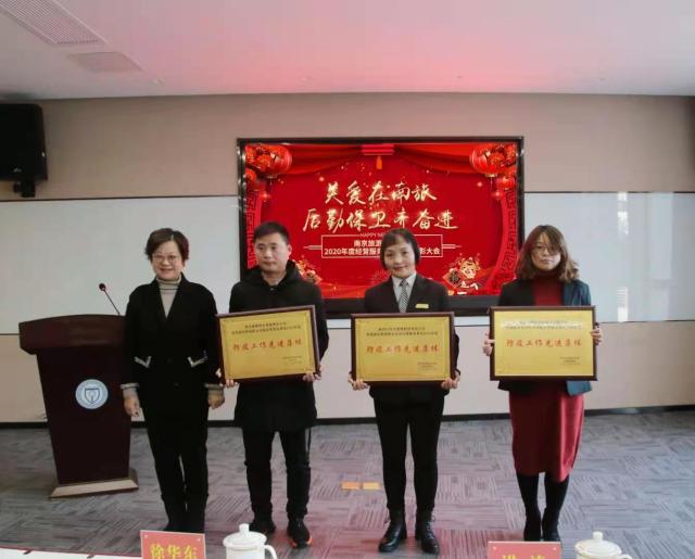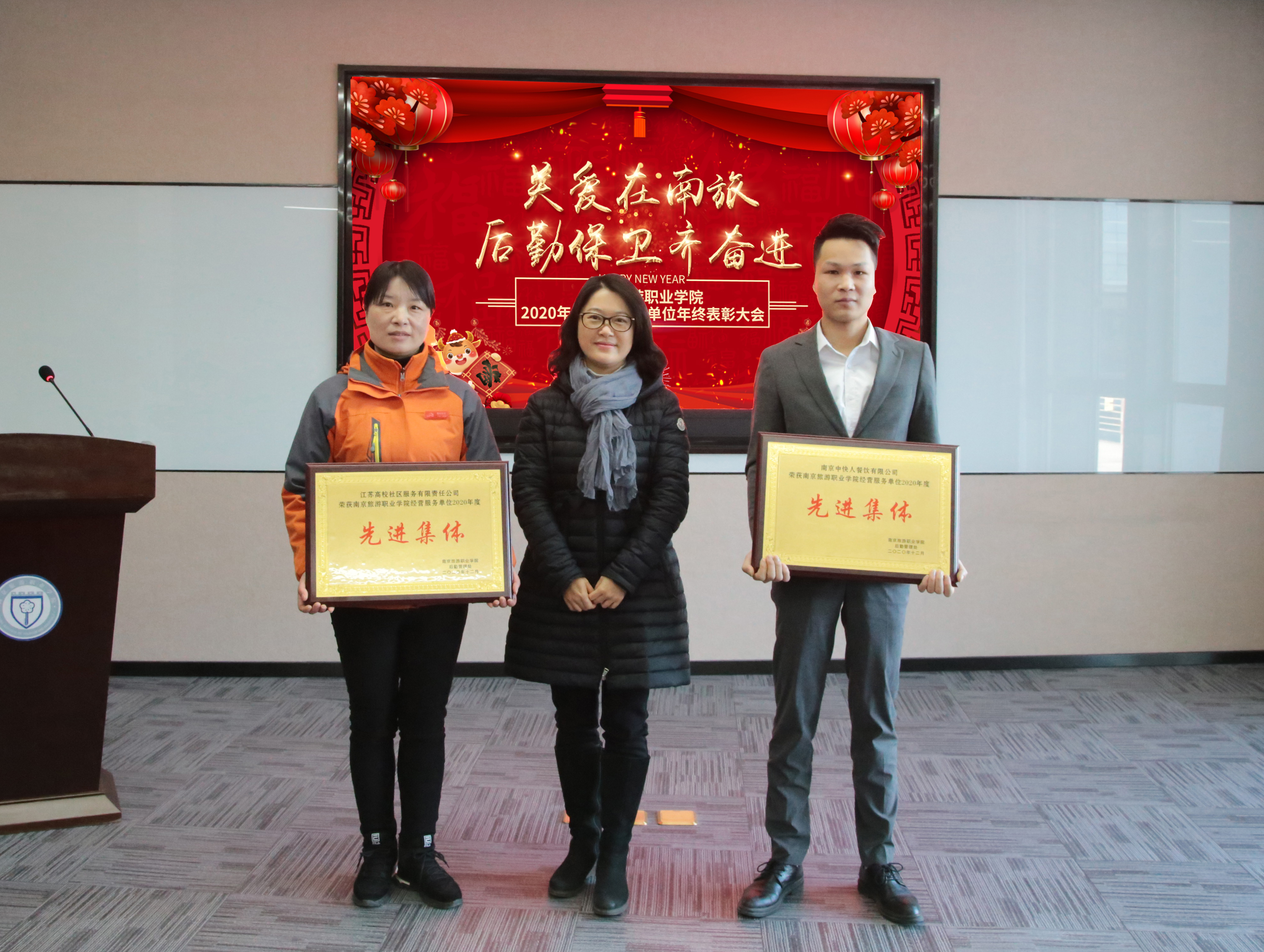 李驰等3名学生获得学院2020年度伙商管会优秀个人,校医务室董晓雪等5名员工获得学院经营服务单位2020年度防疫工作优秀个人,快递店鲁江林等5名员工获得学院经营服务单位2020年优秀个人,保卫爱顺物业、新鸿运物业、大锅饭食堂获得学院经营服务单位2020年度防疫工作先进集体,江苏高校社区物业、中快人食堂获得学院经营服务单位2020年度先进集体。校领导,后勤管理处、保卫处部门负责人为获奖学生和商户颁奖。