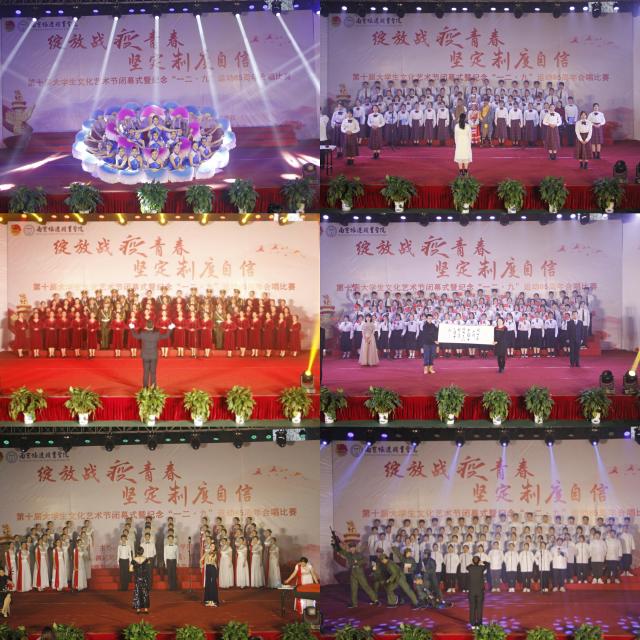 比赛现场,由6个学院推选的十支代表队,他们各展所长、尽显其能、以精彩合唱表达对祖国深深的爱意;以整洁华美的服装、高亢嘹亮的歌声、蓬勃向上的朝气亮相比赛,共同回忆革命征程,轮番展现牢记使命的豪情。其中,歌曲《国家》唱出了家与国的联系,家是最小国,国是千万家,只有小家才有大国;《走向复兴》给我们勇往直前的力量,激起了我们把祖国变得更加富强的信心;《天耀中华》旋律优美,荡气回肠,完美的展现了新时代美丽中国与时俱进的大美篇章;《保卫黄河》,气势磅礴的合唱赢得现场阵阵掌声,彰显了南旅学子对祖国母亲河雄浑磅礴的赞美;耳熟能详的《大中国》赞美了祖国物产丰富,历史悠久,将美丽的祖国一点点展现在我们眼前……