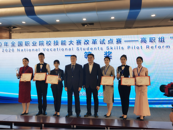 2020年11月24-28日,由教育部、天津市人民政府、山东省人民政府、发改委等37个部委单位主办,山东省教育厅、青岛市人民政府承办,2020年全国职业院校技能大赛改革试点赛(高职组)餐厅服务赛在青岛酒店管理职业技术学院顺利举行。全国各省、市、自治区、计划单列市和新疆生产建设兵团的30支代表队,共60名选手参加。这些参赛选手均是从各省(市)预赛中脱颖而出的佼佼者。伟德国际victor1946酒店管理学院派出2名选手蒋薛菲、郑琪代表江苏省参赛,获得团体组金牌。