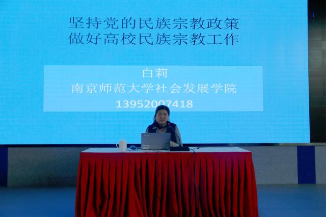 此次培训主题为“坚持党的民族宗教政策,做好高校民族宗教工作”,白教授从当前高校民族宗教工作面临的主要问题、改革开放以来宗教政策的回顾、民族政策的总体思想、新时代宗教政策的指导思想以及如何做好新时代高校民族宗教工作等五个方面对我国民族宗教政策进行了详细解读。白教授指出,我国民族政策以民族团结和少数民族发展作为核心主题,充分体现了我国民族工作“共同团结奋斗、共同繁荣发展”的战略思想。党的十八大以来,以习近平同志为核心的党中央坚持把马克思主义关于宗教的基本原理同新时代宗教问题的实际相结合,发展了中国特色社会主义宗教理论,开辟了宗教工作新时代。在新时代高校民族工作中,还应做好以七个方面的工作:一是加强马克思主义宗教观教育;二是建立健全高校民族宗教工作规章制度;三是推动民族文化融合,加强民族学生的爱国主义教育;四是借助新媒体,创新推动民族宗教工作;五是培养少数民族学生干部;六是开设民族宗教博雅课程或讲座;七是做好对外来极端宗教思潮的防范和学生疏导。