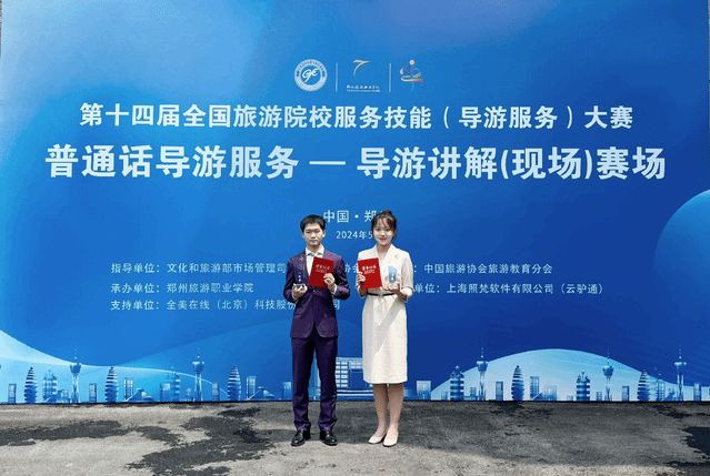 2024年5月23日—5月26日,第十四届全国旅游院校服务技能(导游服务)大赛在郑州旅游职业学院举行。我们旅游管理学院李强、袁宇涵同学荣获中文组一等奖,葛益娟、刘文慧和吕晨璐三位教师获得指导教师奖。
