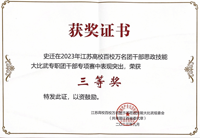 日前,由共青团江苏省委、中共江苏省委教育工委、新华日报社、江苏省学生联合会共同主办的“学思想、跟党走、建新功”江苏高校百校万名团干部思政技能大比武决赛在宿迁学院落幕。经过主题团课、思政课现场展示、主题宣讲和提问互动等多个环节的比拼,我们获得决赛三等奖。
