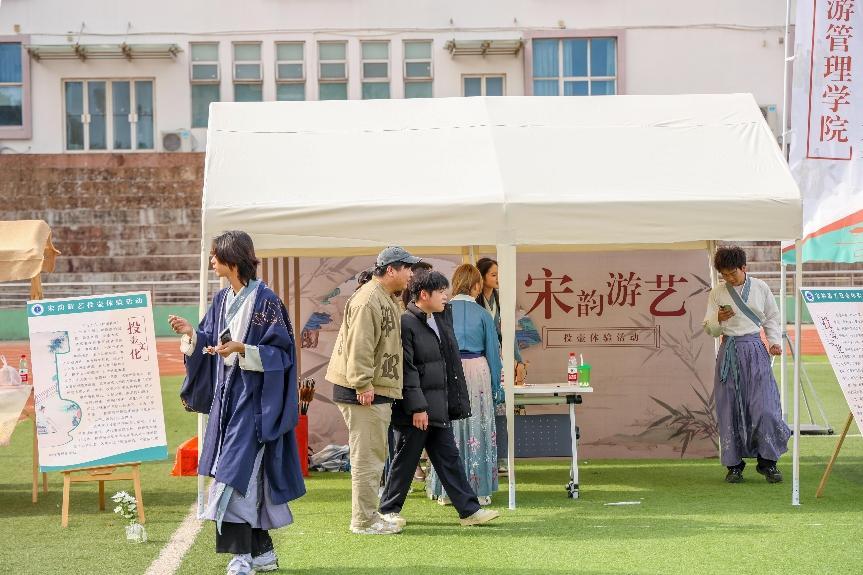 投壶、射箭、斗诗、插花……在旅游管理学院举行的“趣味宋朝”体验活动现场,同学们穿上古色古韵的宋制汉服,参与到宋代特色文娱活动中,学习宋代礼仪,近距离感受宋韵文化魅力。
