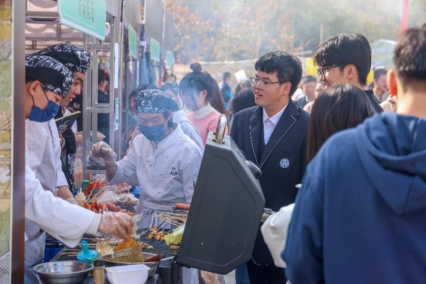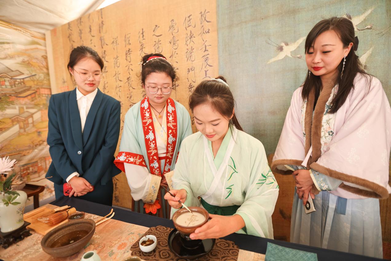 在烹饪与营养学院举办的第12届“博古兴今·宋潮城事”美食文化节上,各具特色的美食摊位前人潮涌动,由同学们自主进行产品设计、制作和营销的各色美食色香味俱全。燃一炉炭火,煮一壶热茶,品尝同学们亲手制作的精美点心,观赏点茶技艺,了解宋代茶食文化……今年的美食节还特别推出沉浸式体验区——宋代“茶寮”体验馆,置身其中,仿佛穿越古今,感受宋人的风雅韵致。