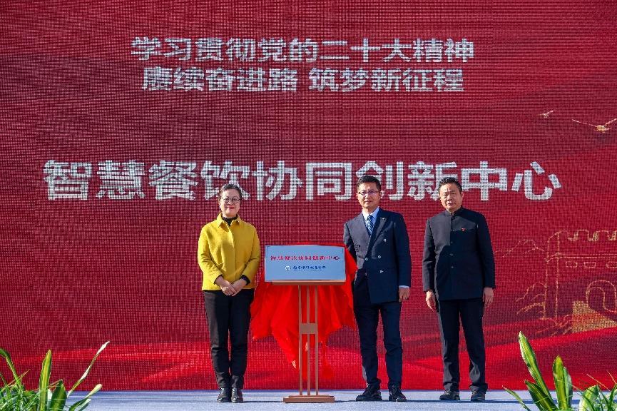 为进一步深化校企合作,深化产教融合、科教融汇、协同育人,培养全面发展的高素质应用型人才,提升服务地方经济社会发展的能力,学院四大协同创新中心和旅游文创产业学院揭牌成立,开幕式上,与会嘉宾为协同创新中心和旅游文创产业学院揭牌。