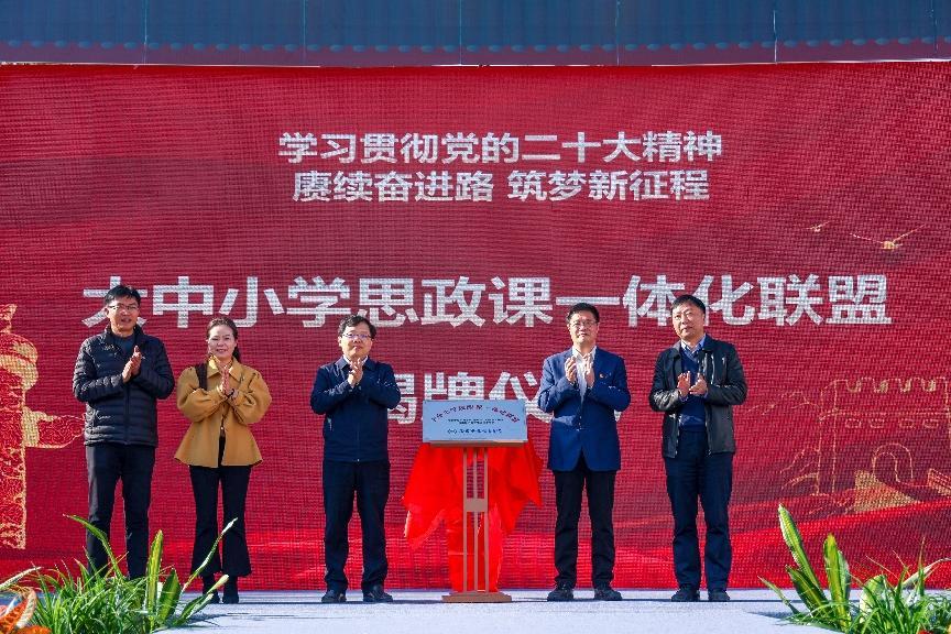 为推进大中小学思政课一体化建设,促进大思政格局构建,学院和南京江宁高等职业技术学校、南京市江宁高新区中学、南京市月华路小学组建了大中小学思政课一体化建设联盟,江苏省教育厅职业教育处副处长李永乐,学院党委书记叶凌波,南京市月华路小学校长夏翠莲、南京江宁高等职业技术学校副校长马富平、南京市江宁高新区中学副校长陶慎中为联盟揭牌。
