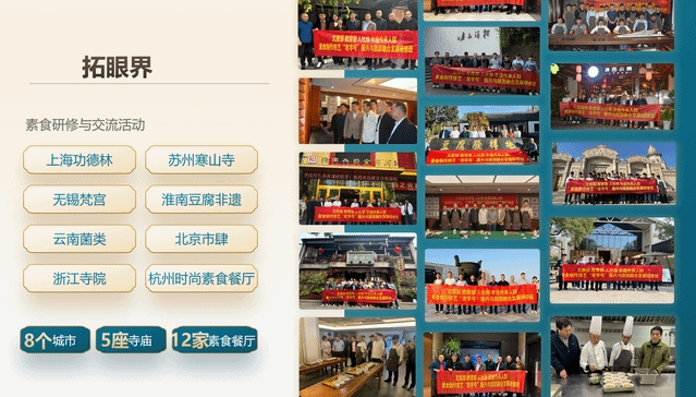 师生们在为期一个月的研修培训中足迹覆盖8个城市,包含5座寺庙和12家素食餐厅,通过集中组织研修汇报会和研讨会,研发创新素食菜点60余道,成果显著。烹饪与营养学院院长吕新河带领专家组对非遗学员进行了为期8天的教学回访,从非物质文化遗产、素食文化、菜品设计和创新理念等提出了大量宝贵的意见和建议,不断提高培训质量,保证培训效果。