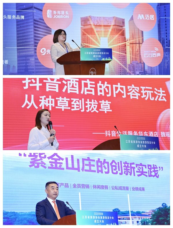 会上,旅游饭店分会举办了第一届论坛,最佳东方副总裁胡小玲、抖音生活服务高星酒店苏沪鲁华东大区负责人魏瑶、紫金山庄董事长徐晓冬分别作分享发言。