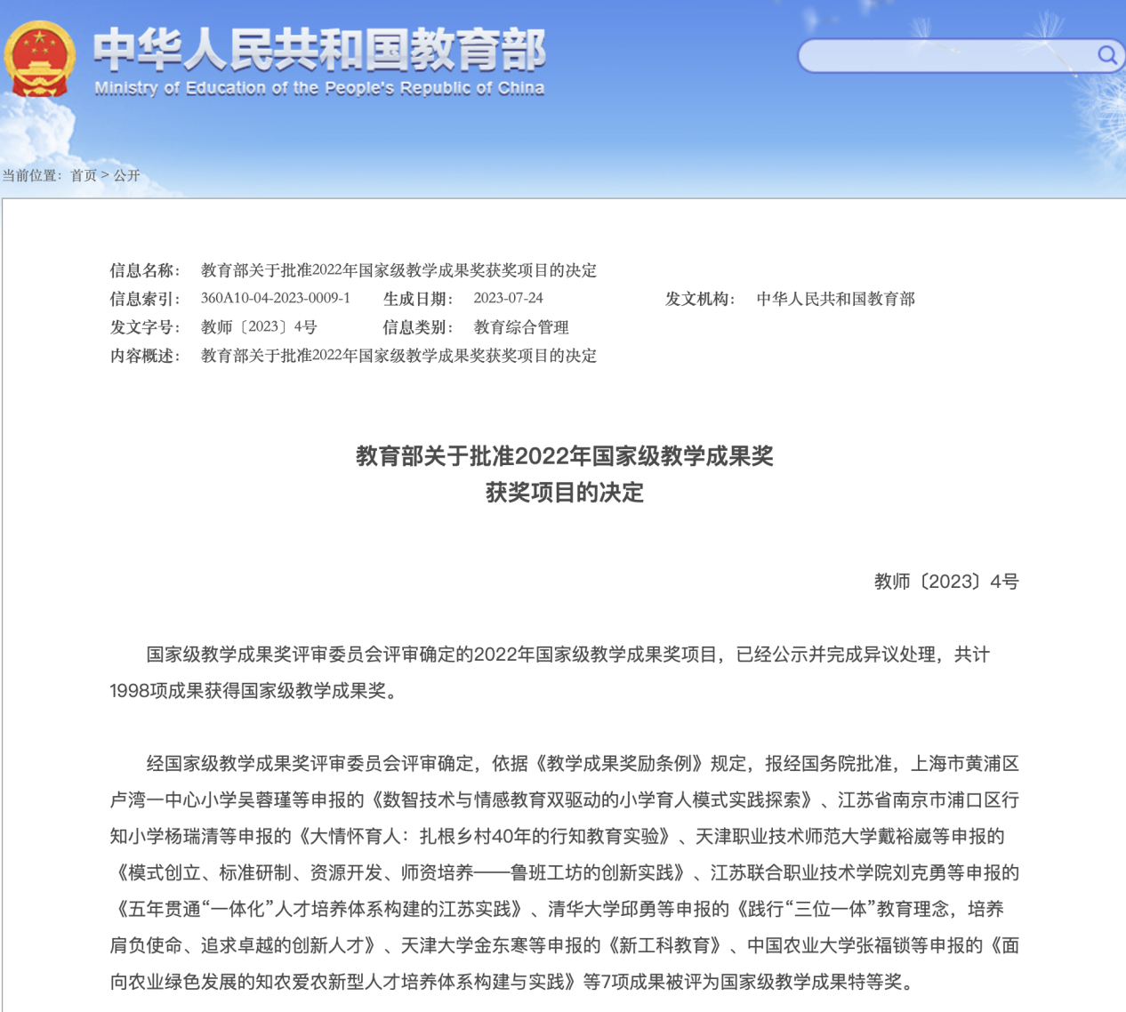 近日,教育部印发了《关于批准2022年国家级教学成果奖获奖项目的决定》,正式公布了2022年国家级教学成果奖获奖项目名单,我们《基于生产性实训基地的院店一体化育人探索与实践》项目荣获职业教育国家级教学成果奖二等奖,这是我们第三次获此殊荣。