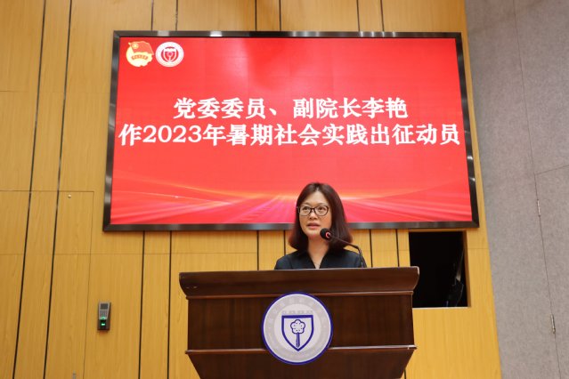 党委委员、副院长李艳作2023年暑期社会实践出征动员。她指出,开展暑期“三下乡”社会实践活动是学院全面贯彻党的教育方针、落实立德树人根本任务的重要举措,是学院思政教育和社会课堂有机融合的重要途径。她对今年社会实践工作提出了三点希望:一是希望各实践团队要坚守锤炼自我的初心,深入基层受教育;二是希望各团队要坚持拼搏忘我的决心,勤思善悟长才干;三是希望各团队要坚定建功有我的信心,挺膺担当作贡献。