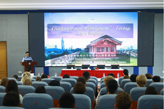 欢迎会后,学院邀请南京市江宁公安分局出入境管理大队丁菲警官为留学生作了安全教育专题讲座。她围绕签证办理、出入境管理、居留许可、校外勤工助学、宗教信仰等法律法规进行系统讲解,结合真实案例强调了遵纪守法的重要性,提醒同学们自觉遵守中国法律和校规校纪。