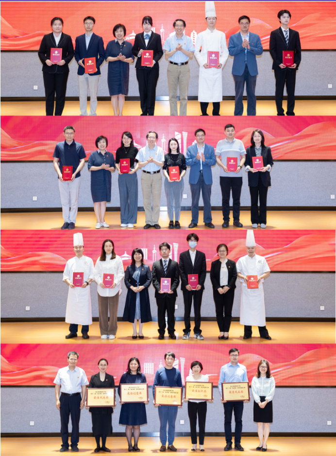 江苏省文化和旅游厅科技教育处二级调研员张人健,学院党委书记周春林,学院党委副书记、院长叶凌波为获得2023年江苏省职业院校技能大赛一等奖的学生和指导教师代表颁奖;学院党委委员、副院长操阳,学院党委委员、副院长洪涛为2023年江苏省职业院校技能大赛教师组获奖老师和三等奖获奖学生颁奖;学院党委委员、副院长李艳,学院纪委书记金同胜为获奖单位颁奖。