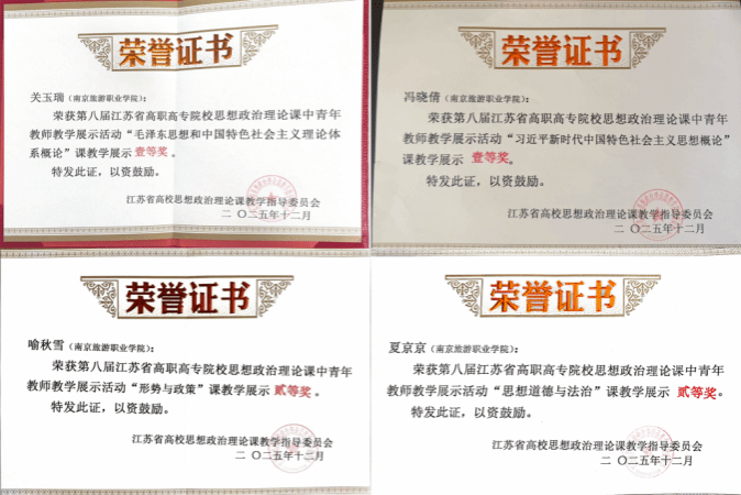 12月13日-14日,第八届江苏省高职高专院校思政课中青年教师教学展示活动顺利落幕,我们思政课教师关玉瑞获“毛泽东思想和中国特色社会主义理论体系概论”课程一等奖、冯晓倩获“习近平新时代中国特色社会主义思想概论”课程一等奖、喻秋雪获“形势与政策”课程二等奖、夏京京获“思想道德与法治”课程二等奖,首次实现参赛课程全部获奖。