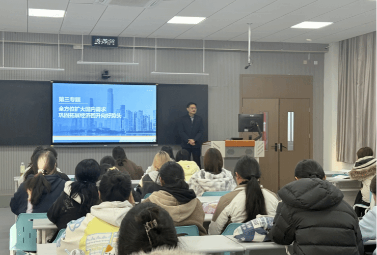 院党委委员、副院长张骏以《全方位扩大国内需求 巩固拓展经济回升向好势头》为主题,为25会展策划与管理1班、25空中乘务1班讲授了形势与政策课。课上,张骏结合江苏文旅的新业态、新模式、新场景,深刻剖析了消费、投资、供给与需求的协同关系,通过分析夜间经济、沉浸式演艺、文旅融合IP打造等新兴消费热点,引导青年学生思考自身专业在促进服务消费、提升旅游体验中的重要作用,鼓励同学们立足专业优势,积极参与到文旅融合、消费升级的实践中去,为推动区域经济高质量发展贡献青春力量。