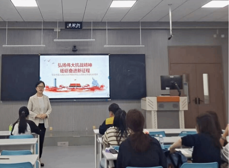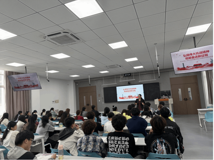 院党委副书记朱琰以《弘扬伟大抗战精神 砥砺奋进新征程》为主题,为25智慧旅游技术1班、2班讲授了形势与政策课。课上,朱琰从抗战历史的关键节点切入,运用了丰富的案例,结合江苏抗战史实,生动讲述了本地抗日英烈抛头颅、洒热血的英雄事迹,带领同学们重温了中华民族艰苦卓绝的抗战岁月,深刻阐释了伟大抗战精神的核心要义与时代价值,并勉励同学们在新时代新征程上展现南旅学子的青春风采,为推动旅游业高质量发展注入青春力量。