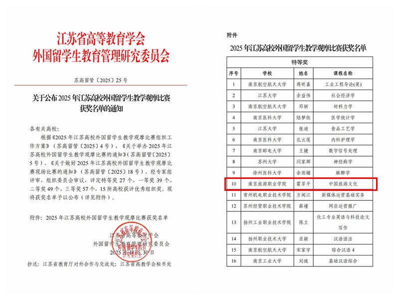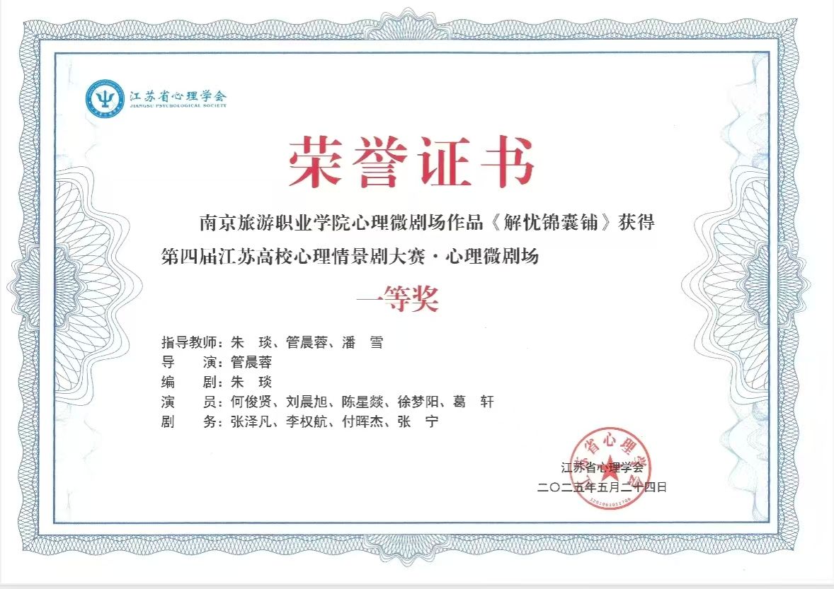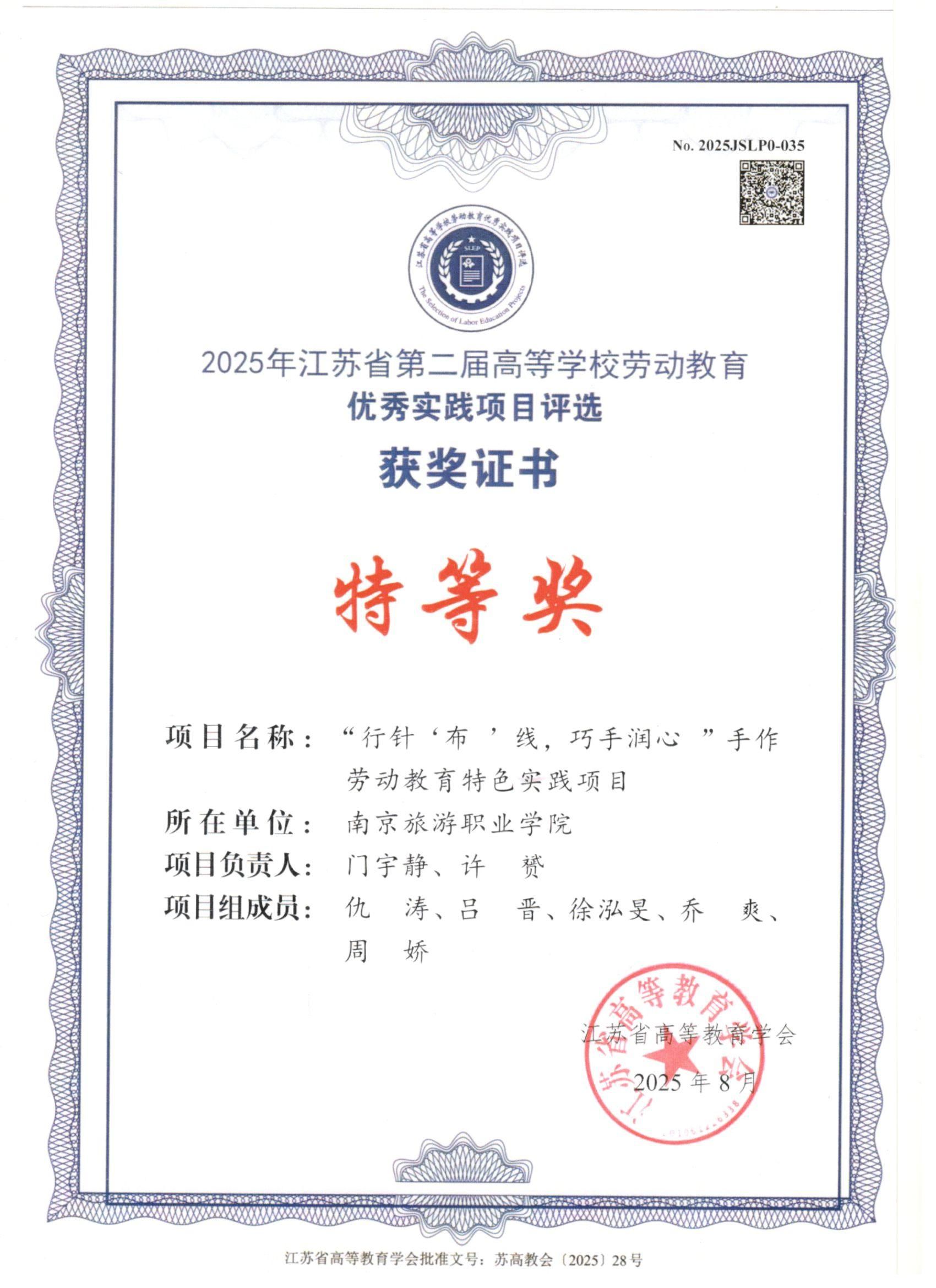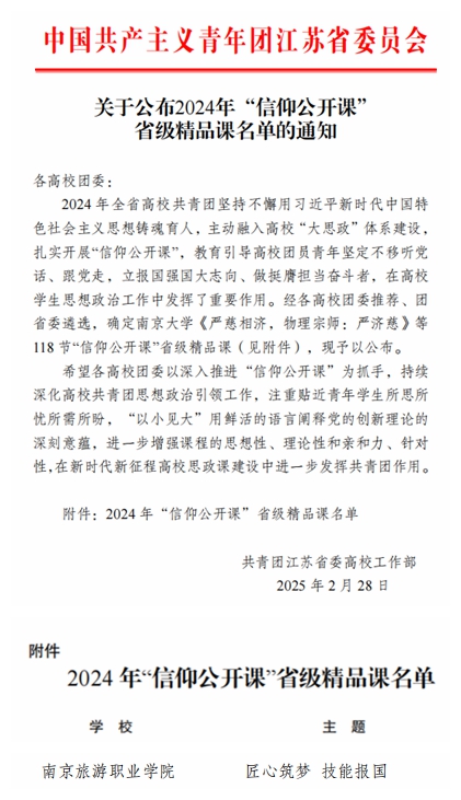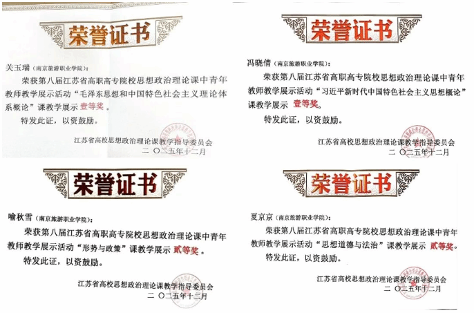 提高新时代立德树人工程实施质效,多维度做好“大思政课”顶层设计。推进网络思政中心建设,全面强化“一站式”学生社区建设,打造“两厅四站六中心”立体思政空间。加入雨花台“大思政课”实践教学基地联盟,与江宁区委统战部(民宗局)合作共建“大思政课”实践教学基地。“大思政课”教学成果丰硕,入选全国旅游行指委课程思政案例2个,4名青年教师在第八届江苏省高职高专院校思想政治理论课中青年教师教学展示活动中分获一二等奖,1项课程入选第二批江苏省红色研学精品思政课程,获评共青团江苏省委“信仰公开课”省级精品示范课,获江苏省高校网络思政“金微课”二等奖、三等奖各1项,获江苏省“典耀中华 赓续文脉”大赛一等奖1项、二等奖2项、优秀奖1项,获第四届江苏高校心理情景剧大赛一等奖1项、二等奖1项、“沉浸式”剧本乐三等奖2项、最佳剧本奖1项,获省劳动教育优秀实践项目特等奖1项、二等奖1项,6项作品在江苏省教育系统关工委2025年主题教育读书征文和“读懂中国”活动中获奖。
